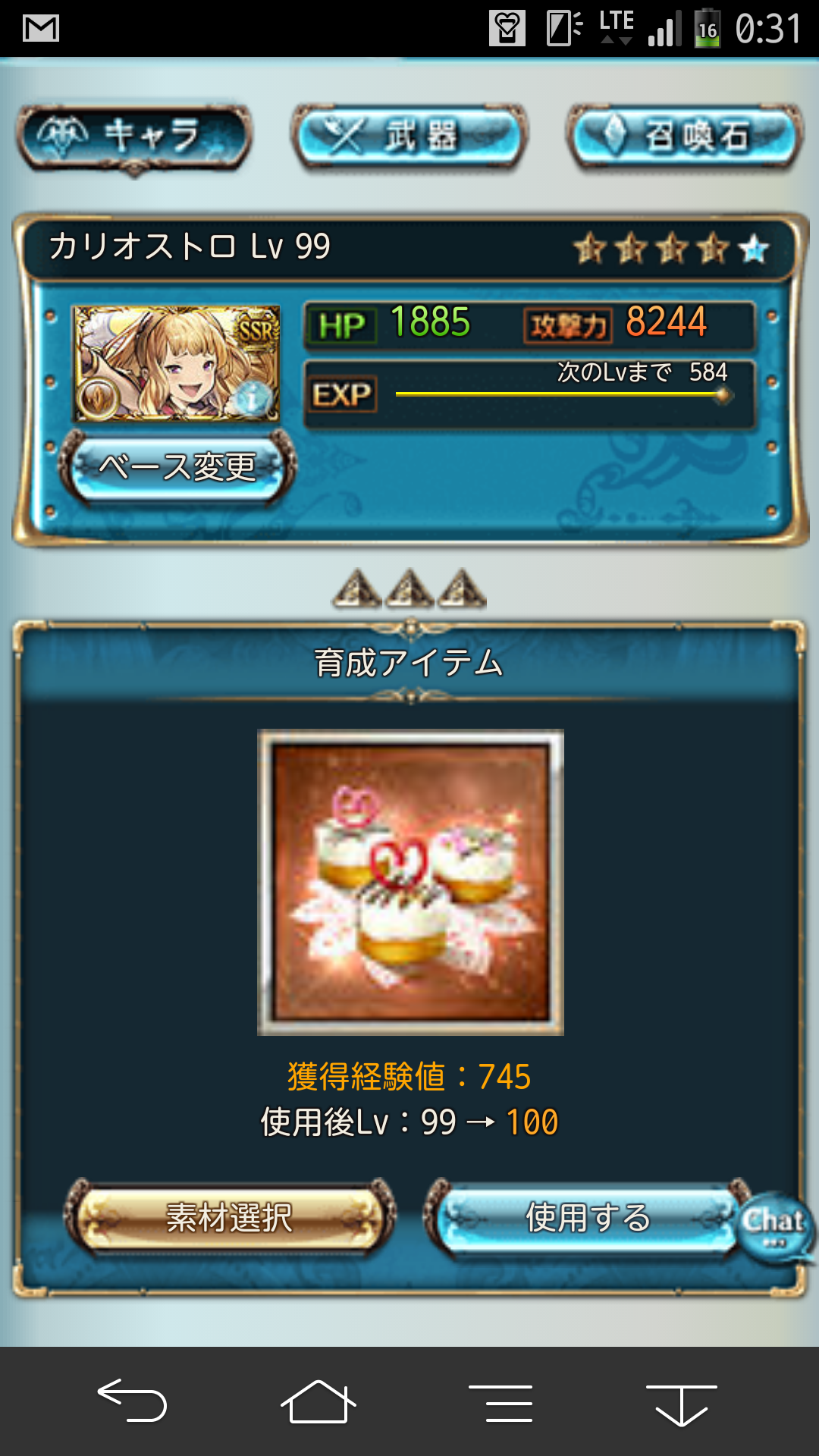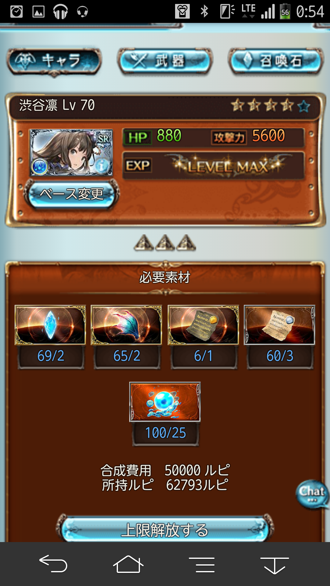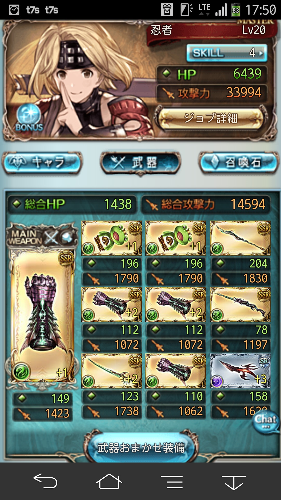 そういえば上限解放されてたなぁと思ってやってみました。 まだ解放されてから間もないので詳細は伏せますが、 上限解放クエストは全てゲストキャラにソシエを迎えて進みます。 ストーリーはユエルの過去にまつわる話なので、 このイベントを見るとファンが増えそうですね。 全ての戦闘が主人公、ユエル、ソシエの3人で進みます。 1回目 2回目 3回目 戦闘の難易度はかなり低めです。 ユエルのレベルを80まで育成しているという前提条件で見れば、 特に問題になることはないかと思います。 んでもって、無事上限解放。 ビジュアルが一気に可愛くなりました。 ついでにエロイ。 本当に良い脇とフトモモ。 運営さんは本当に良い仕事をしたと思います。 めっちゃGJ! 上限解放に必要なアイテムはこんな感じ。 こちらも特に問題にならず無事限界突破。 レベル100になるとスタメン入り確定しそうな性能になるので、 カリオストロがカンストしたら次はユエルですねー。 95で強化されるスキルも協力なので まずはそこを目指して育成していきたいですね! カニ漁飽きた。 カニイベ、いろいろこってるのは良いんですけど、 正直ストーリーがネタ過ぎて辛い。 可愛い女の子も出てこないので、ウチには辛いとです。 貢献度300万は到達したので、 あとは金賞を300集めるのみ。 残り40切ったので明日には終了かなと。 そんなわけでそろそろ止まっていた武器の強化に向けて 計画を練っていこうかなという次第です。 武器が比較的揃っている風か、 武器はまだ中途半端ではあるものの マグナ石が3凸出来てる水か悩んだのですが、 結局、アンノウンがしっかり揃っている風を まずは完成させる 方向で動いていこうかと。 石についてはアナト3凸がカニ漁前に完成出来たので、 残りはマグナ攻刃のスキル上げですね。 現状のスキルはこんな感じ。